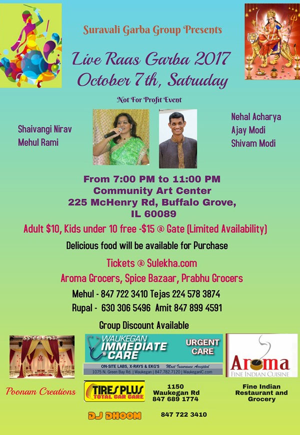 Once again and 16th year in a row, Suravali Garba Group presents traditional Live Raas Garba. If you like traditional garba, this is the place for you. With well known Gujarati Sangeet Artist, Shaivangi Nirav and known band players, this will be a treat. We will start at 7 and end at 11 PM sharp.